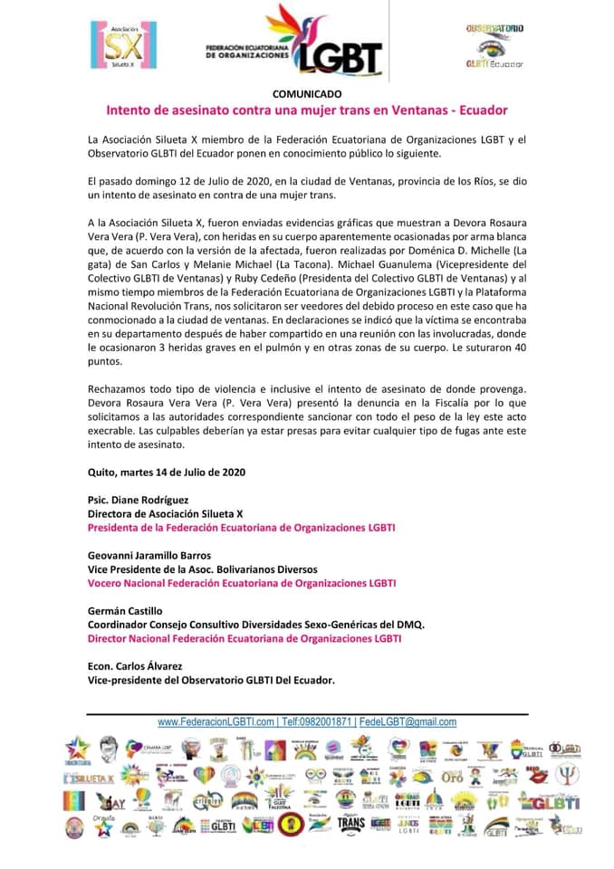 El pasado domingo 12 de Julio de 2020, en la ciudad de Ventanas, provincia de los Ríos, se dio un intento de asesinato en contra de una mujer trans.