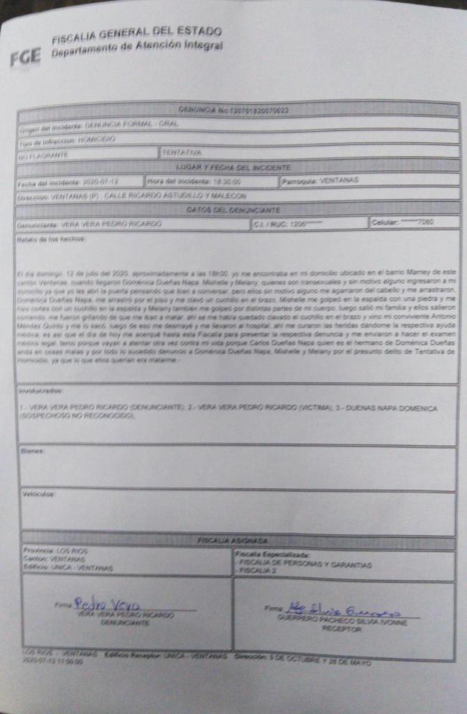 Rechazamos todo tipo de violencia e inclusive el intento de asesinato de donde provenga. Devora Rosaura Vera Vera (P. Vera Vera) presentó la denuncia en la Fiscalía por lo que solicitamos a las autoridades correspondiente sancionar con todo el peso de la ley este acto execrable. Las culpables deberían ya estar presas para evitar cualquier tipo de fugas ante este intento de asesinato.