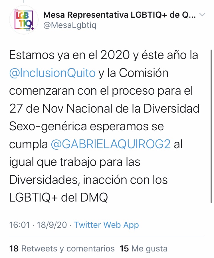 “Otro retroceso los Consejo Consultivos de los 10 grupos vulnerables fueron cambiados de nombre Cómite Consultivo irrespetando la ordenanza y constitución, hace una año pedimos rectificación en Código Municipal y No hay respuesta @DerechosQuito @LoroHomero @GissChalaUIO”, afirmaron también los líderes de las organizaciones que articulan en la Mesa LGBTIQ+ de Quito.