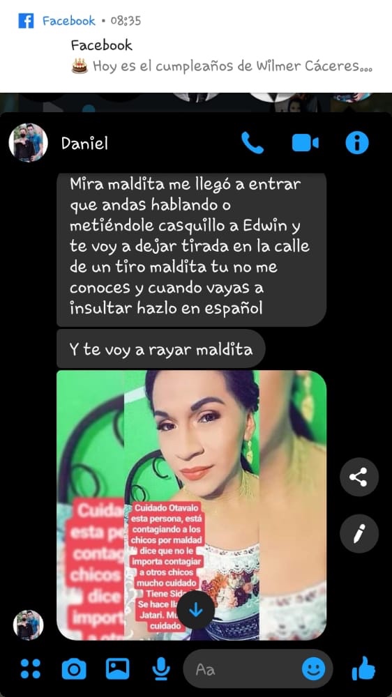 «Mira maldita me llegó a «entrar» que andas hablando y metiéndole casquillo a Edwin y te voy a dejar tirada en la calle de un tiro maldita tu no me conoces y cuando vayas a insultar hazlo en español… y te voy a rayar maldita» es el mensaje que circula en redes de la supuesta amenaza que abría realizado «Daniel», a una Trans de Otavalo.