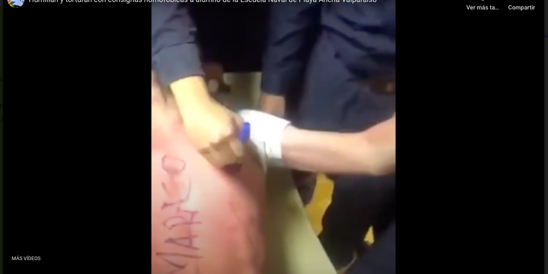 Lo tienen tomado de manos y pies, como crucificado, mientras le gritan, se ríen de él y lo golpean entre varios. La víctima está con los ojos vendados y se le ve contornearse y quejarse de dolor. Después le escriben en el torso con un lápiz de tinta azul: “Maraco, fleto” (en Chile son términos usados de forma despectiva para referirse a los hombres homosexuales). Esas imágenes circularon por redes sociales desde la noche del 27 de octubre y se hicieron virales en el país. Según la cuenta que las publicó, el video fue grabado el 4 de agosto de este año, durante el aniversario de la Escuela Naval Playa Ancha de Valparaíso.