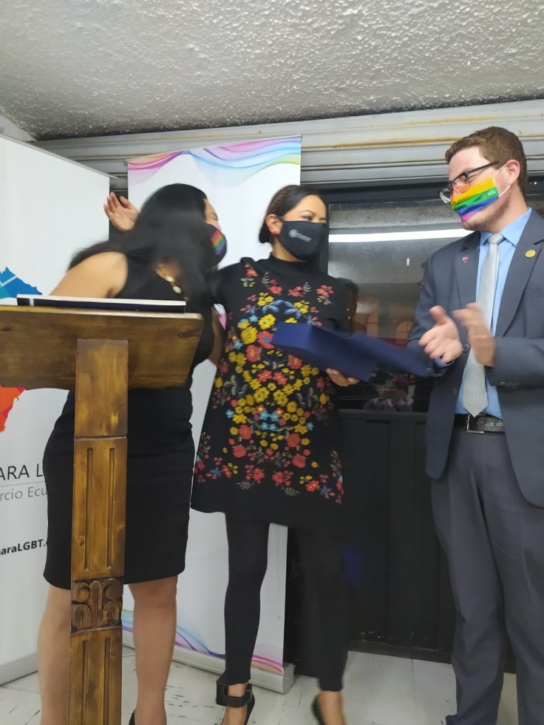 En ese sentido la CCLGBTEC, a través de Emilio Cruz, coordinador corporativo nacional, entregó un reconocimiento a Purita y Nebraska, por su contribución a la Despenalización de la Homosexualidad en Ecuador.