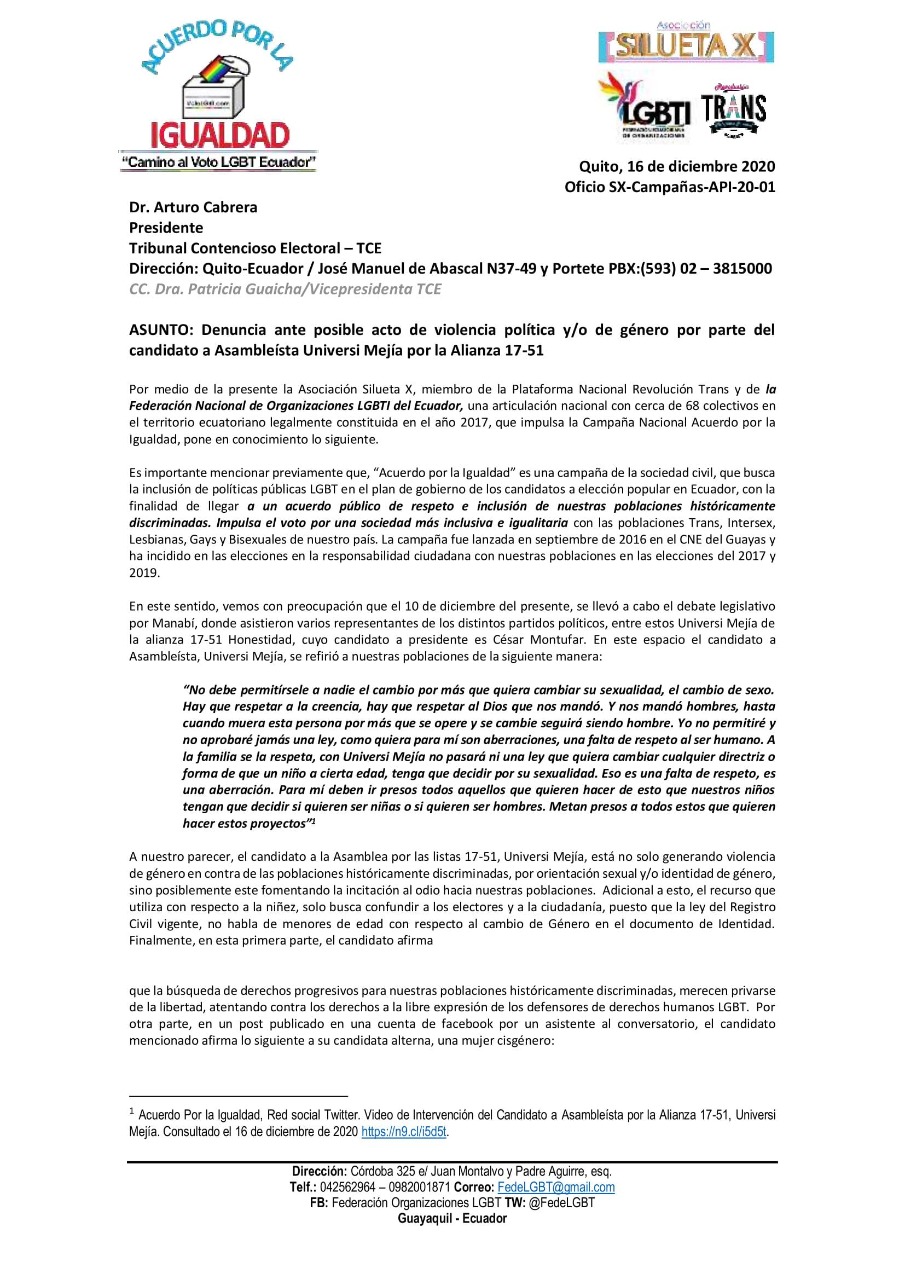 Por medio de la presente la Asociación Silueta X, miembro de la Plataforma Nacional Revolución Trans y de la Federación Nacional de Organizaciones LGBTI del Ecuador, una articulación nacional con cerca de 68 colectivos en el territorio ecuatoriano legalmente constituida en el año 2017, que impulsa la Campaña Nacional Acuerdo por la Igualdad, pone en conocimiento lo siguiente.