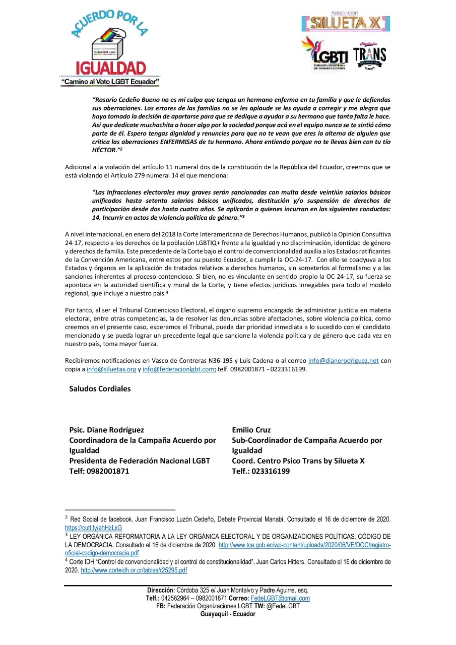 Recibiremos notificaciones en Vasco de Contreras N36-195 y Luis Cadena o al correo info@dianerodriguez.net con copia a info@siluetax.org y info@federacionlgbt.com; telf. 0982001871 – 0223316199.