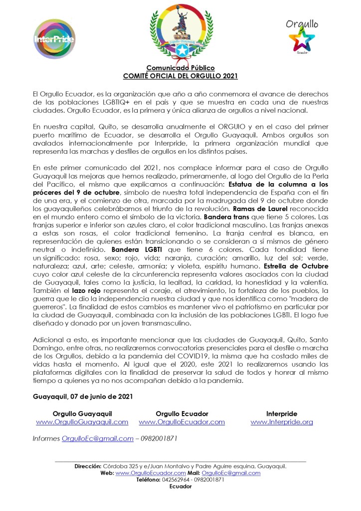 Adicional a esto, es importante mencionar que las ciudades de Guayaquil, Quito, Santo Domingo, entre otras, no realizaremos convocatorias presenciales para el desfile o marcha de los Orgullos, debido a la pandemia del COVID19, la misma que ha costado miles de vidas hasta el momento. Al igual que el 2020, este 2021 lo realizaremos usando las plataformas digitales con la finalidad de preservar la salud de todos y honrar al mismo tiempo a quienes ya no nos acompañan debido a la pandemia.