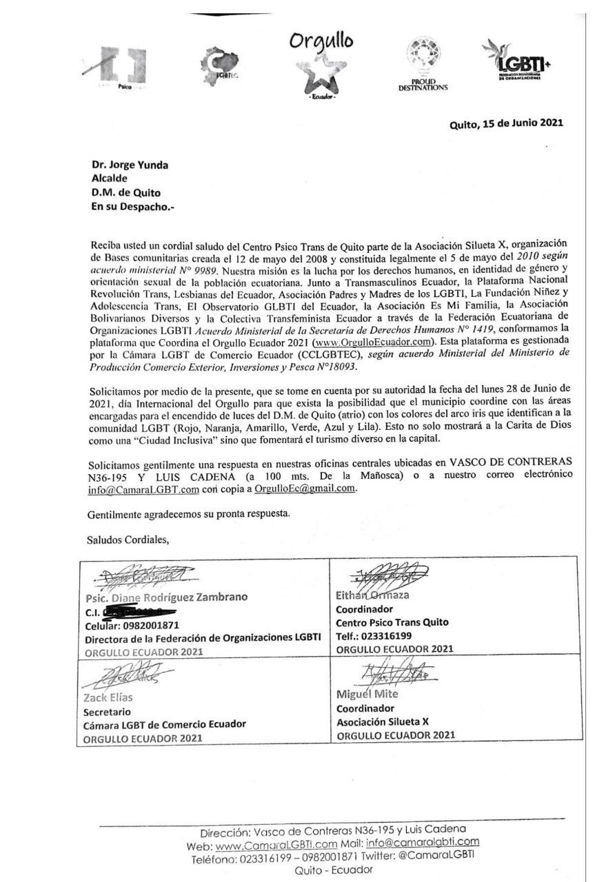 Nos complace saber que tanto la Presidencia de la República del Ecuador, el Municipio de Guayaquil y el Municipio de Quito, hayan atendido nuestro pedido de iluminación de fachadas, atrios, y monumentos simbólicos en las ciudades mencionadas. Las solicitudes fueron enviadas el 02/Jun, 07/jun, 15/jun respectivamente por parte del equipo logístico de la Cámara LGBT de Ecuador en Quito y la Asociación Silueta X en Guayaquil, mismos que administran las plataformas de Orgullo Ecuador y Orgullo guayaquil.