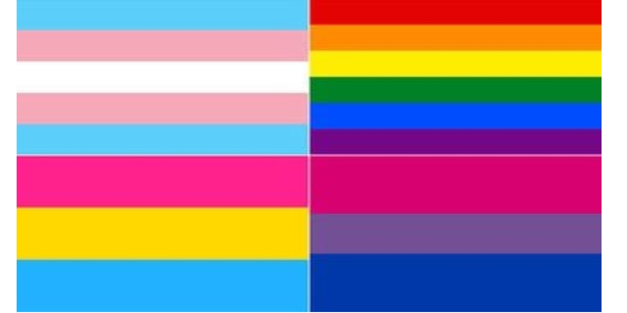 La bandera del orgullo transgénero consiste en cinco bandas horizontales en azul celeste, rosa y blanco. Según la autora, una mujer transexual, Monica Helms, se trata de los colores tradicionales para vestir a los niños y niñas mezclados con el blanco, en representación de aquellos que se encuentran en transición.