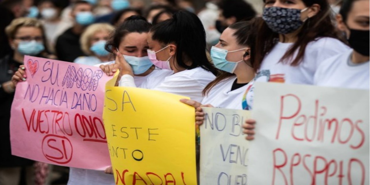 También se han convocado manifestaciones en Asturias, Aragón, Castilla y León, Cataluña, Castilla-La Mancha, Comunidad Valenciana, La Rioja, Murcia, Andalucía, Extremadura y Madrid. En la capital de España, miles de personas se ha reunido en la Puerta del Sol. El lema de la protesta era: “Ninguna muerte más por odio, intolerancia y discriminación”. La mayoría eran jóvenes, pero también muchos adultos han aireado su protesta. “A Samuel lo mataron por maricón. Queremos llamar a la insurrección”, ha afirmado un portavoz con megáfono. Diego Rubia, 21 años, alzaba un cartel que rezaba: “Nos quitasteis la adolescencia, ahora nos quitáis la vida”. “Estamos aquí por Samuel, pero no solo por él, sino por todo el que sufre o pueda sufrir agresiones homófobas”, protestaba Rubia, sin bajar sus brazos en alto. Cuando se enteró de la noticia sintió una “frustración” que pronto se transformó en un “pánico horrible”. “Me dio miedo como gay, pero no solo por mí, también por los niños que están sufriendo lo que yo sufrí, lo que todos los homosexuales, trans o mujeres siguen padeciendo”. Cree que hay partidos políticos que, en vez de ayudar a la sociedad, están dando voz a la homofobia o al machismo. “Por eso es importante que nos vean, que nos oigan y darles voz a los que ya no la tienen”.