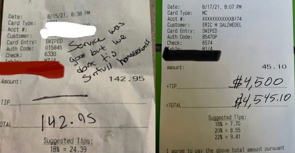 “El servicio fue bueno pero no damos propina a pecadores homosexuales”, escribieron en la factura, algo que el usuario Eric Salzwedel compartió. A diferencia de quienes le escribieron aquello, este hombre aseguró que no hay problema porque otros sí darían ese pago.