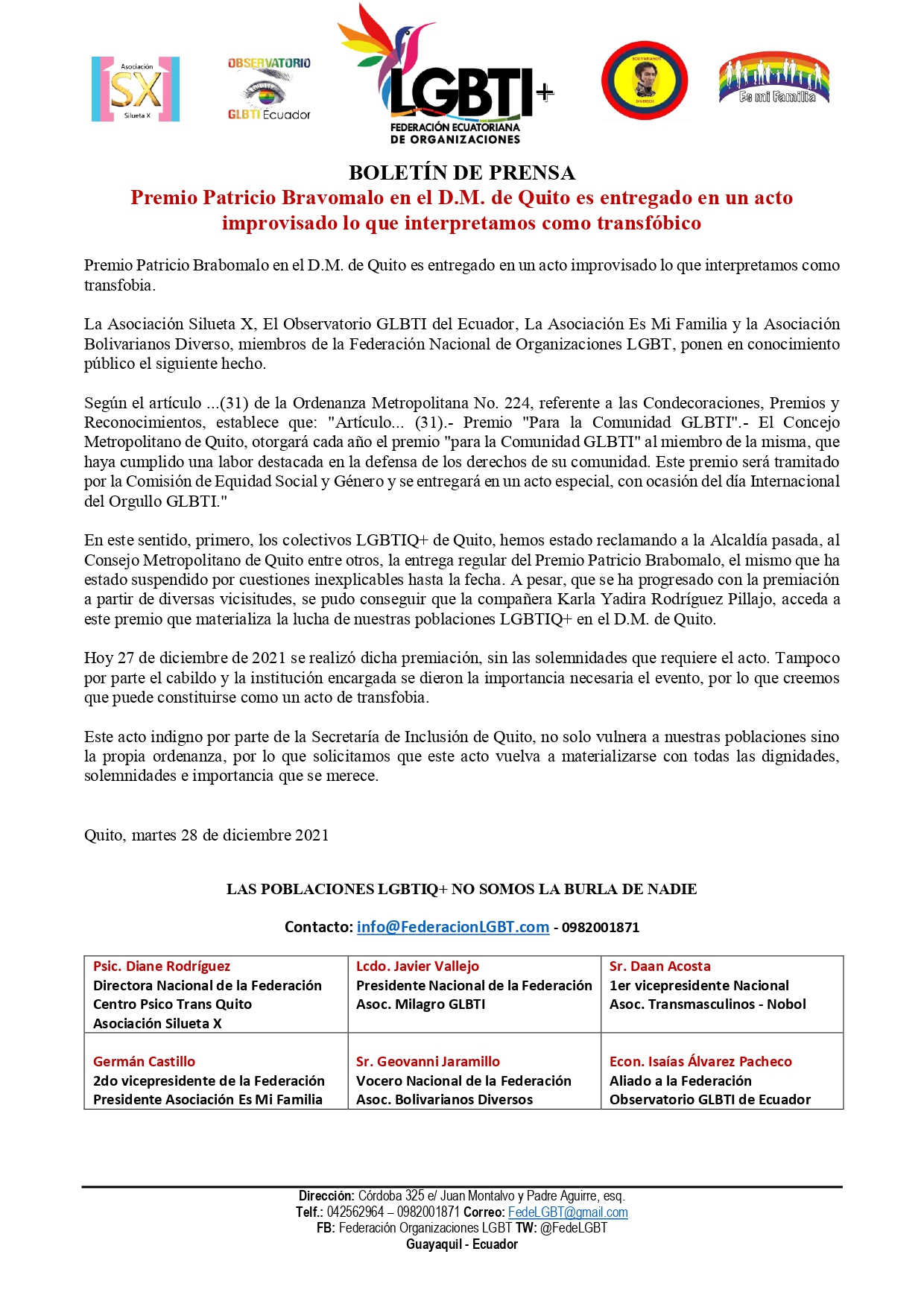 La Asociación Silueta X, El Observatorio GLBTI del Ecuador, La Asociación Es Mi Familia y la Asociación Bolivarianos Diverso, miembros de la Federación Nacional de Organizaciones LGBT, ponen en conocimiento público el siguiente hecho.
