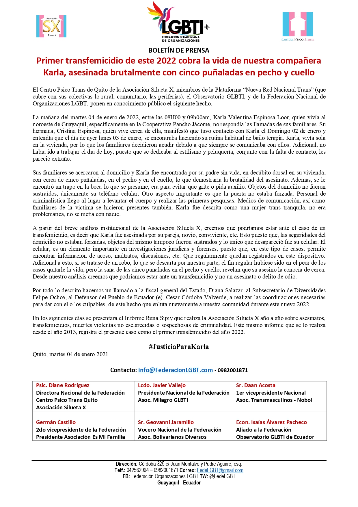 El Centro Psico Trans de Quito de la Asociación Silueta X, miembros de la Plataforma “Nueva Red Nacional Trans” (que cubre con sus colectivas lo rural, comunitario, las periferias), el Observatorio GLBTI, y de la Federación Nacional de Organizaciones LGBT, ponen en conocimiento público el siguiente hecho.