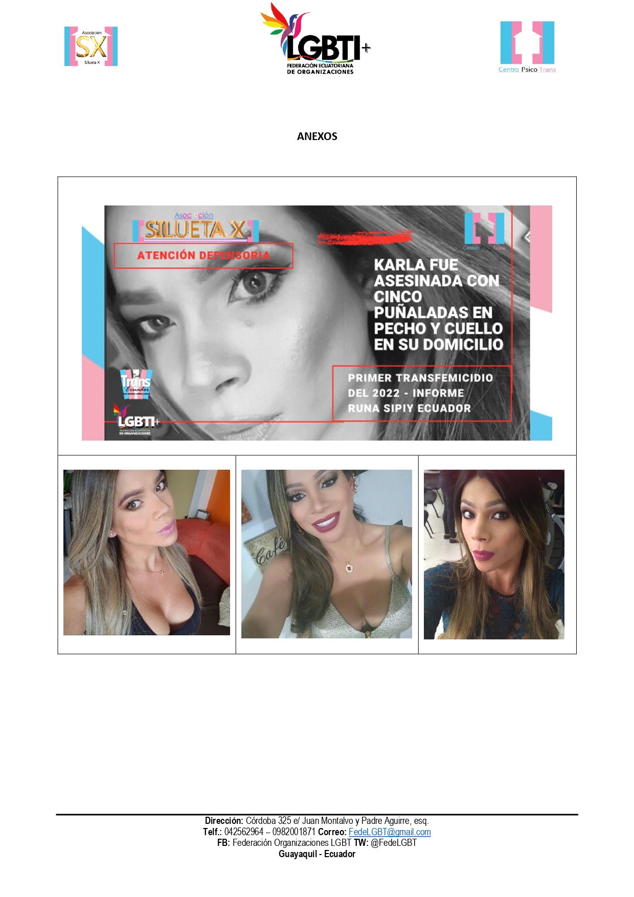 Por todo lo descrito hacemos un llamado a la fiscal general del Estado, Diana Salazar, al Subsecretario de Diversidades Felipe Ochoa, al Defensor del Pueblo de Ecuador (e), Cesar Córdoba Valverde, a realizar las coordinaciones necesarias para dar con el o los culpables, de este hecho que enluta nuevamente a nuestra comunidad durante este nuevo 2022.