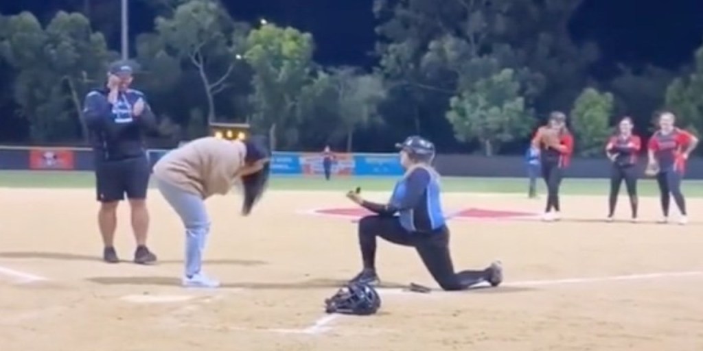 Los miembros del otro equipo fueron a ver cómo estaba, al igual que su entrenador, antes de que alguien llamara a su novia, Jacinta Comande, para que la ayudara. Sara luchó por levantarse, pero todo fue una artimaña. Se puso de rodillas y abrió una caja de anillos.