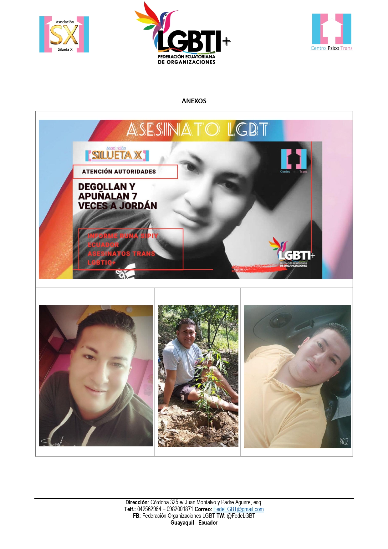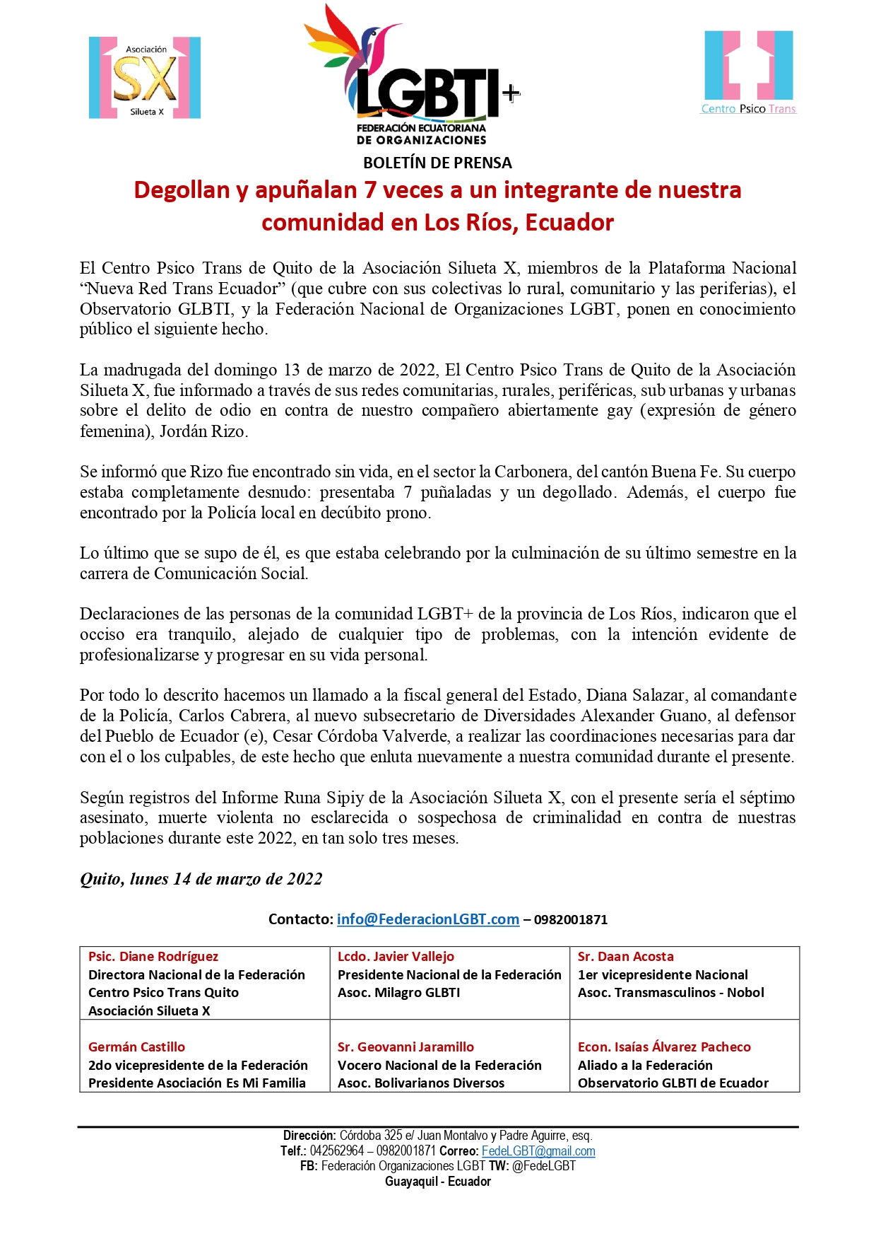 La madrugada del domingo 13 de marzo de 2022, El Centro Psico Trans de Quito de la Asociación Silueta X, fue informado a través de sus redes comunitarias, rurales, periféricas, sub urbanas y urbanas sobre el delito de odio en contra de nuestro compañero abiertamente gay (expresión de género femenina), Jordán Rizo.
