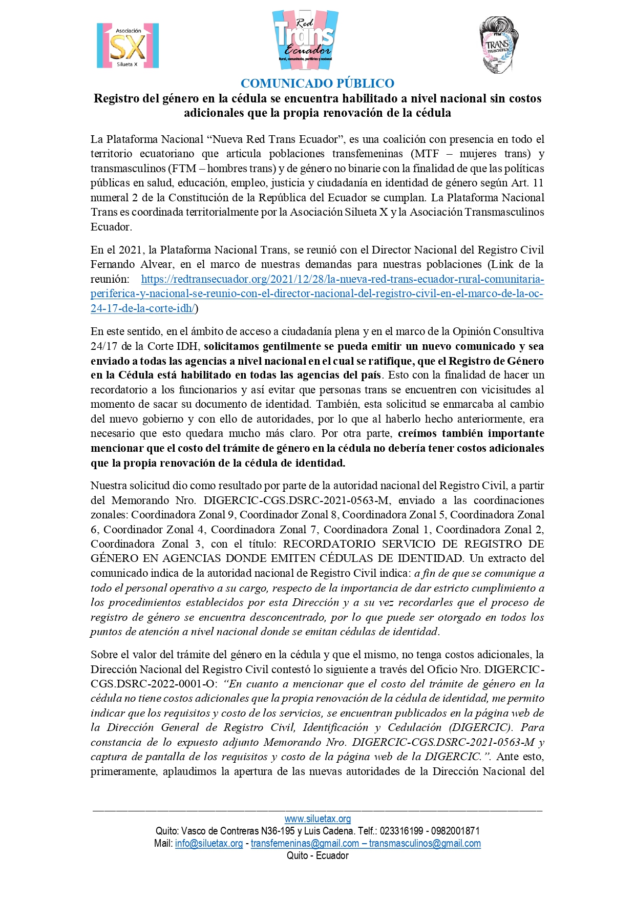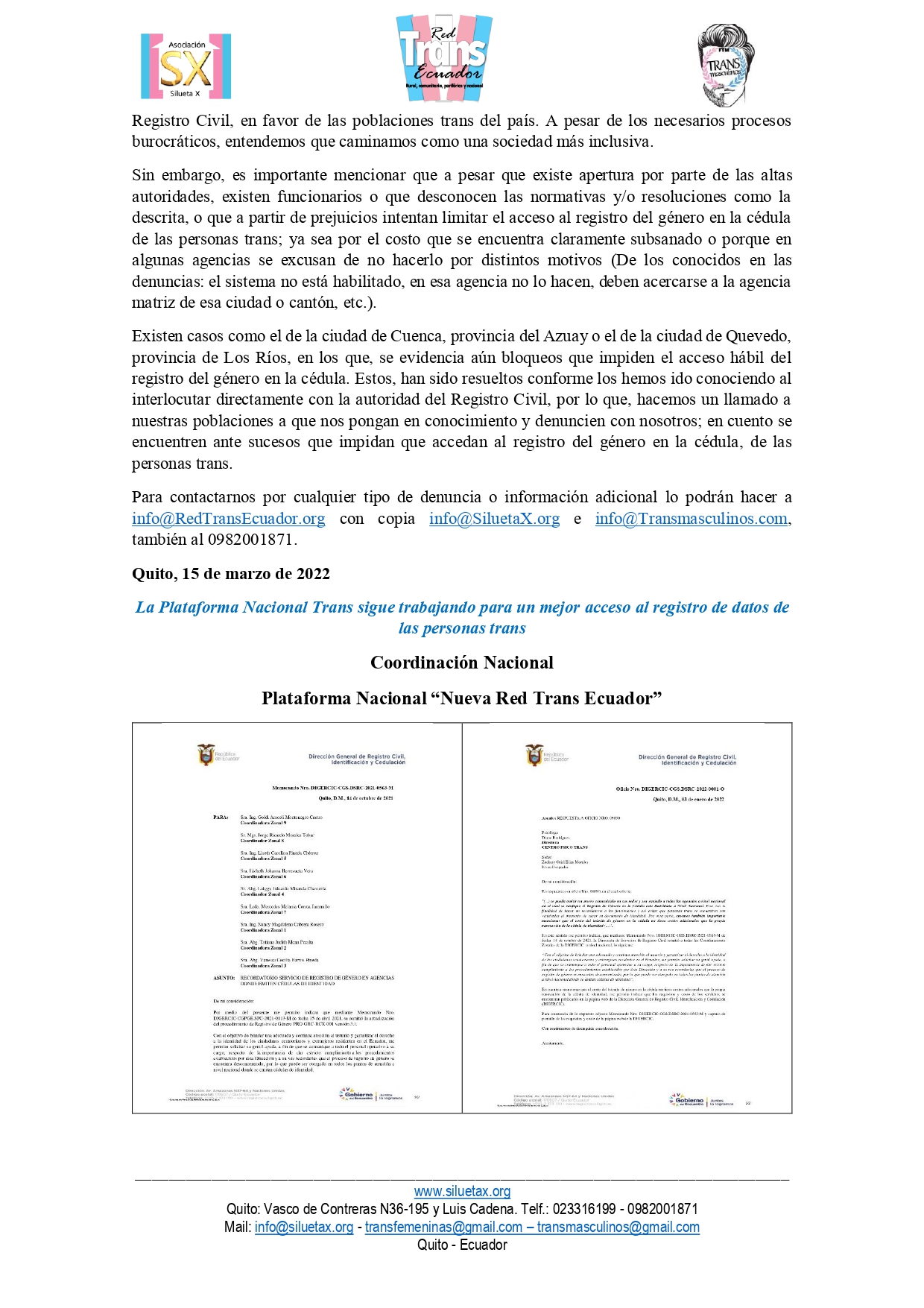 Para contactarnos por cualquier tipo de denuncia o información adicional lo podrán hacer a info@RedTransEcuador.org con copia info@SiluetaX.org e info@Transmasculinos.com, también al 0982001871.