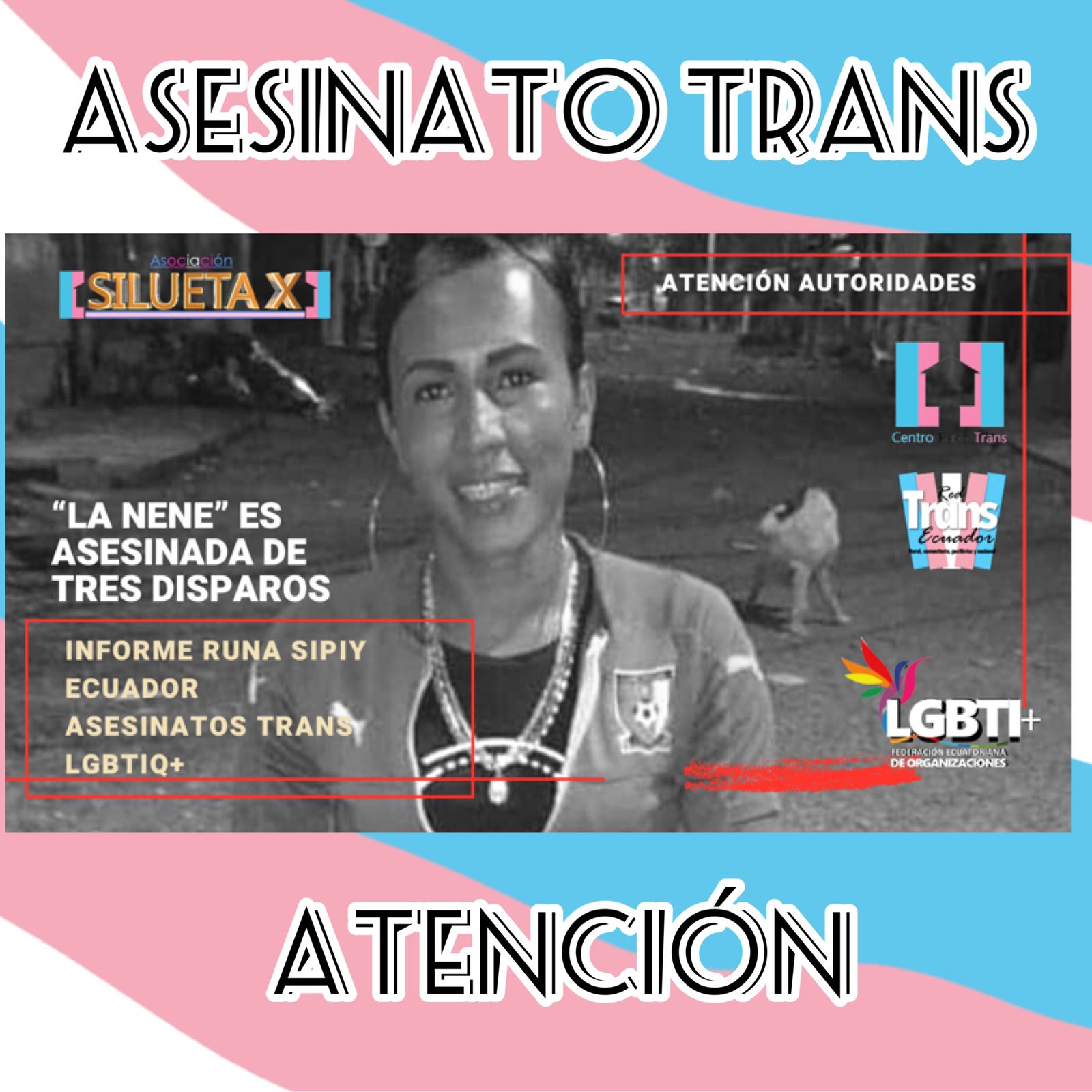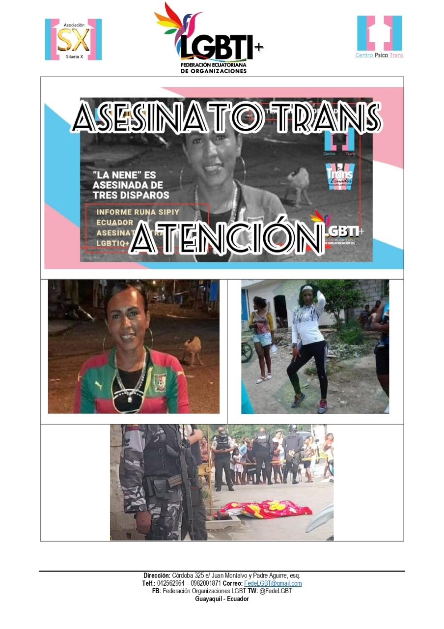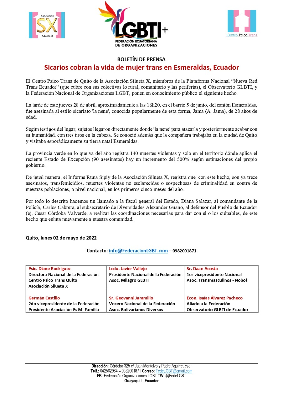 El Centro Psico Trans de Quito de la Asociación Silueta X, miembros de la Plataforma Nacional “Nueva Red Trans Ecuador” (que cubre con sus colectivas lo rural, comunitario y las periferias), el Observatorio GLBTI, y la Federación Nacional de Organizaciones LGBT, ponen en conocimiento público el siguiente hecho.