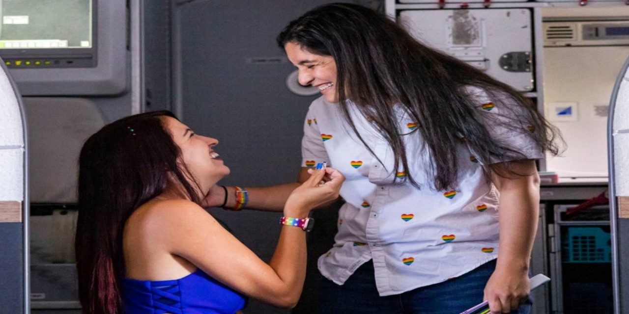 Ambas se conocieron en la misma aerolínea dos años atrás, explicó Alejandra, la piloto. El día de la pedida de mano, la aerolínea estaba en plena celebración del Orgullo con su lema «Fly with pride» por lo que engalanaron el avión de los colores del arcoíris y decidieron regalar a los pasajeros presentes en la pedida, otro vuelo para cada uno (de haberlo sabido me voy a Los Ángeles).