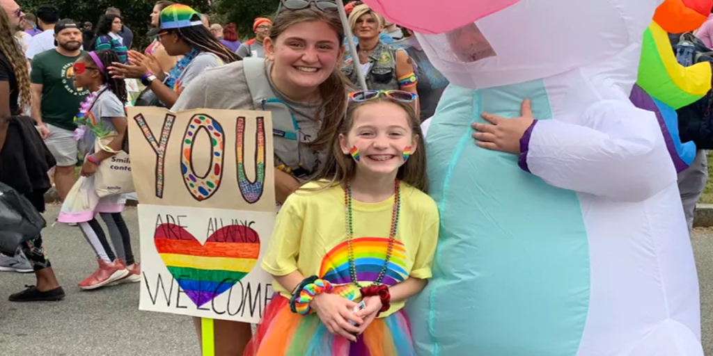 «Esta es una foto de una de mis hijas, Breana, junto con una amiga nuestra de nuestra iglesia. Mi esposo y yo llevamos a nuestras tres hijas al Atlanta Pride y todos ayudamos a trabajar en el stand de nuestra iglesia abierta y afirmativa, Johns Creek Christian Church, ubicada en Johns Creek, Georgia. Este fue nuestro primer Orgullo y, lamentablemente, Atlanta no ha tenido uno en vivo desde 2019 año debido a la pandemia. Mi hija, Breana, tenía 8 años en ese momento, y dado que su hermana gemela es transgénero e hizo la transición a la edad de seis años, sabíamos que era hora de llevar a nuestras tres niñas con nosotros a nuestro primer Orgullo. Fue increíble y tenemos muchas esperanzas de tener otra oportunidad de celebrar el Orgullo de Atlanta en persona; ¡Ojalá este año!