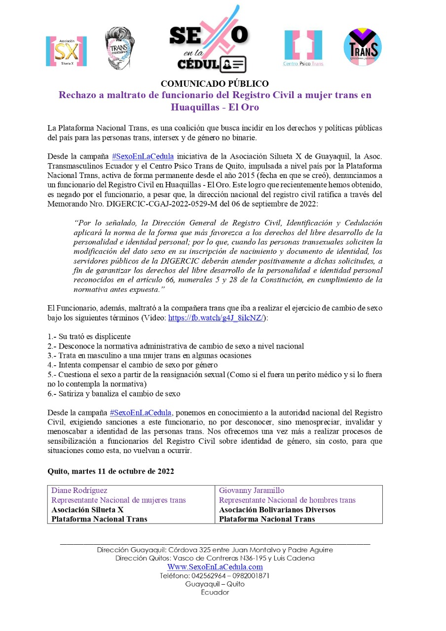 Desde la campaña #SexoEnLaCedula iniciativa de la Asociación Silueta X de Guayaquil, la Asoc. Transmasculinos Ecuador y el Centro Psico Trans de Quito, impulsada a nivel país por la Plataforma Nacional Trans, activa de forma permanente desde el año 2015 (fecha en que se creó), denunciamos a un funcionario del Registro Civil en Huaquillas – El Oro. Este logro que recientemente hemos obtenido, es negado por el funcionario, a pesar que, la dirección nacional del registro civil ratifica a través del Memorando Nro. DIGERCIC-CGAJ-2022-0529-M del 06 de septiembre de 2022:
