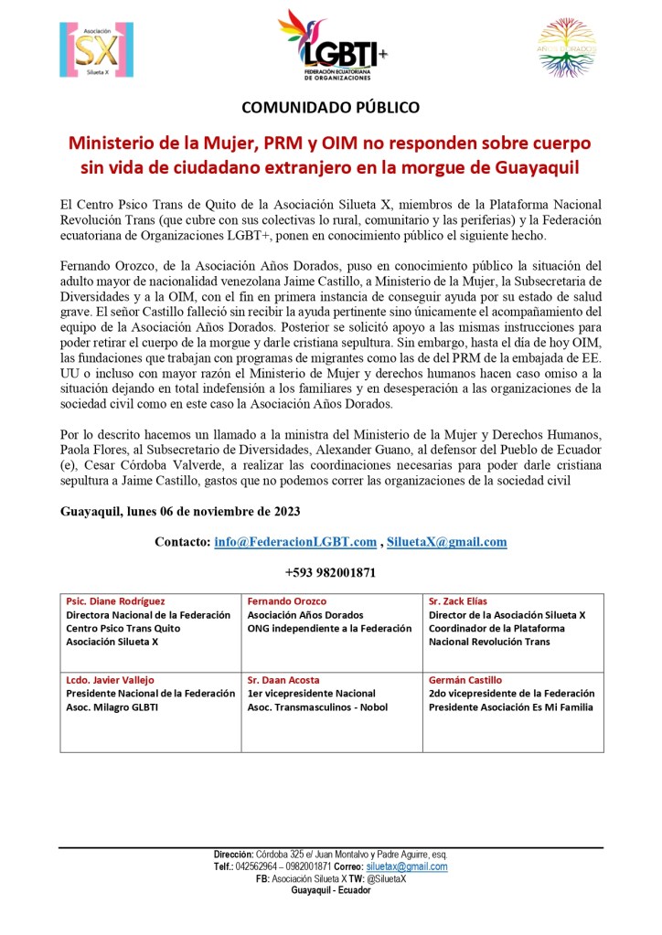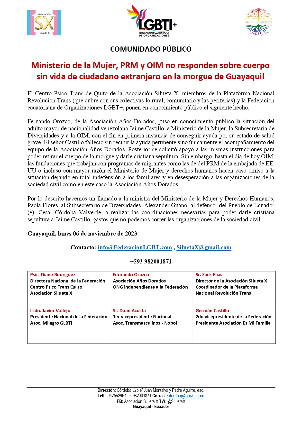 El Centro Psico Trans de Quito de la Asociación Silueta X, miembros de la Plataforma Nacional Revolución Trans (que cubre con sus colectivas lo rural, comunitario y las periferias) y la Federación ecuatoriana de Organizaciones LGBT+, ponen en conocimiento público el siguiente hecho.