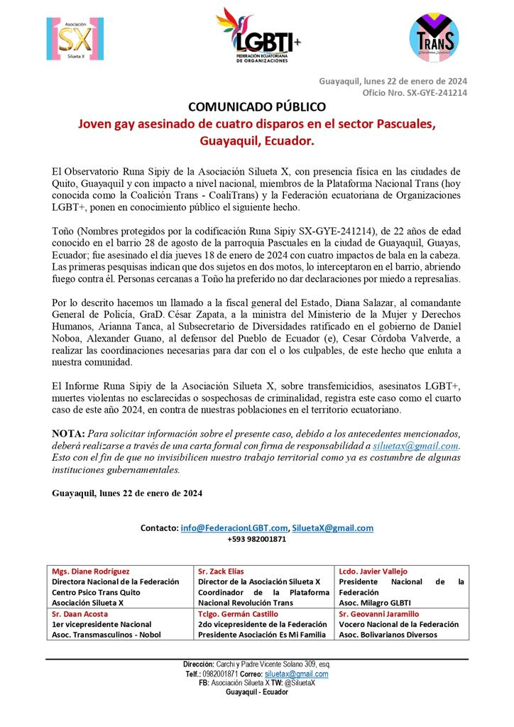 COMUNICADO PÚBLICO – Joven gay asesinado de cuatro disparos en el sector Pascuales,
