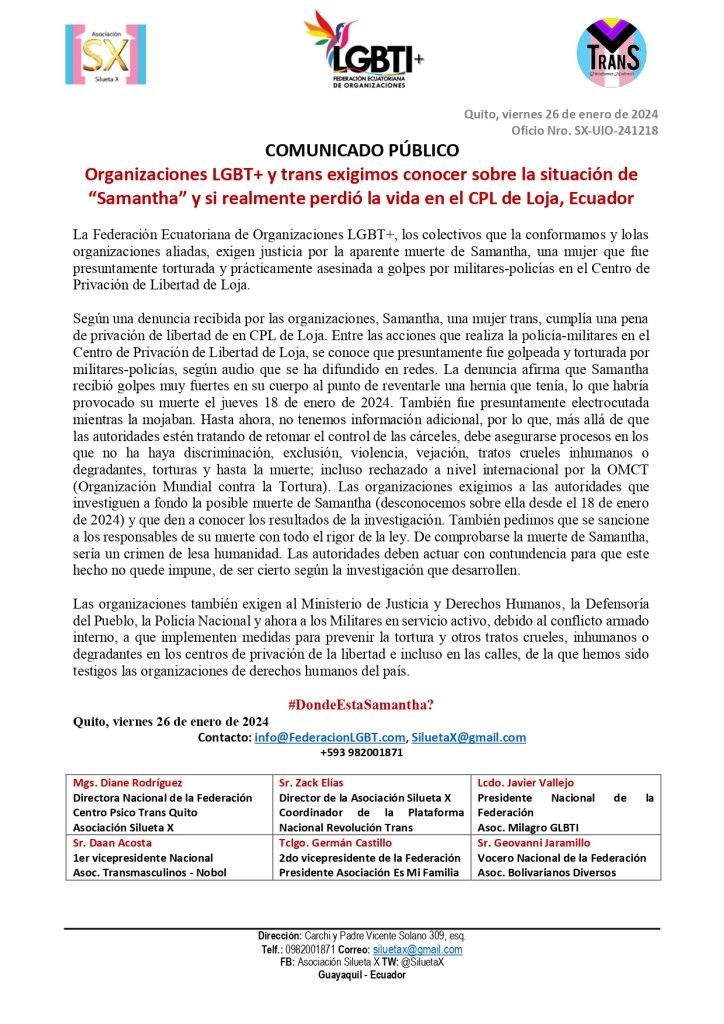 Según una denuncia recibida por las organizaciones, Samantha, una mujer trans, cumplía una pena de privación de libertad de en CPL de Loja. Entre las acciones que realiza la policía-militares en el Centro de Privación de Libertad de Loja, se conoce que presuntamente fue golpeada y torturada por militares-policías, según audio que se ha difundido en redes. La denuncia afirma que Samantha recibió golpes muy fuertes en su cuerpo al punto de reventarle una hernia que tenía, lo que habría provocado su muerte el jueves 18 de enero de 2024. También fue presuntamente electrocutada mientras la mojaban. Hasta ahora, no tenemos información adicional, por lo que, más allá de que las autoridades estén tratando de retomar el control de las cárceles, debe asegurarse procesos en los que no ha haya discriminación, exclusión, violencia, vejación, tratos crueles inhumanos o degradantes, torturas y hasta la muerte; incluso rechazado a nivel internacional por la OMCT (Organización Mundial contra la Tortura). Las organizaciones exigimos a las autoridades que investiguen a fondo la posible muerte de Samantha (desconocemos sobre ella desde el 18 de enero de 2024) y que den a conocer los resultados de la investigación. También pedimos que se sancione a los responsables de su muerte con todo el rigor de la ley. De comprobarse la muerte de Samantha, sería un crimen de lesa humanidad. Las autoridades deben actuar con contundencia para que este hecho no quede impune, de ser cierto según la investigación que desarrollen.